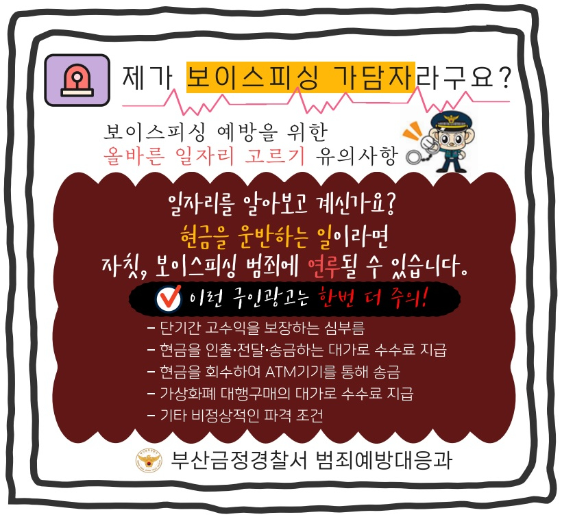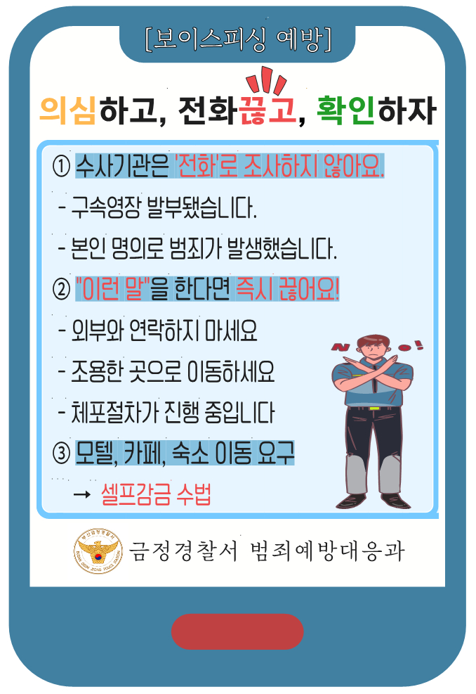 fnctId=bbs,fnctNo=3096 작성일 2025.12.18 수정일 2025.12.18 작성자 오혜람 조회수 6 [금정경찰서] 보이스피싱 예방 안내 첨부파일 첨부파일이(가) 없습니다.