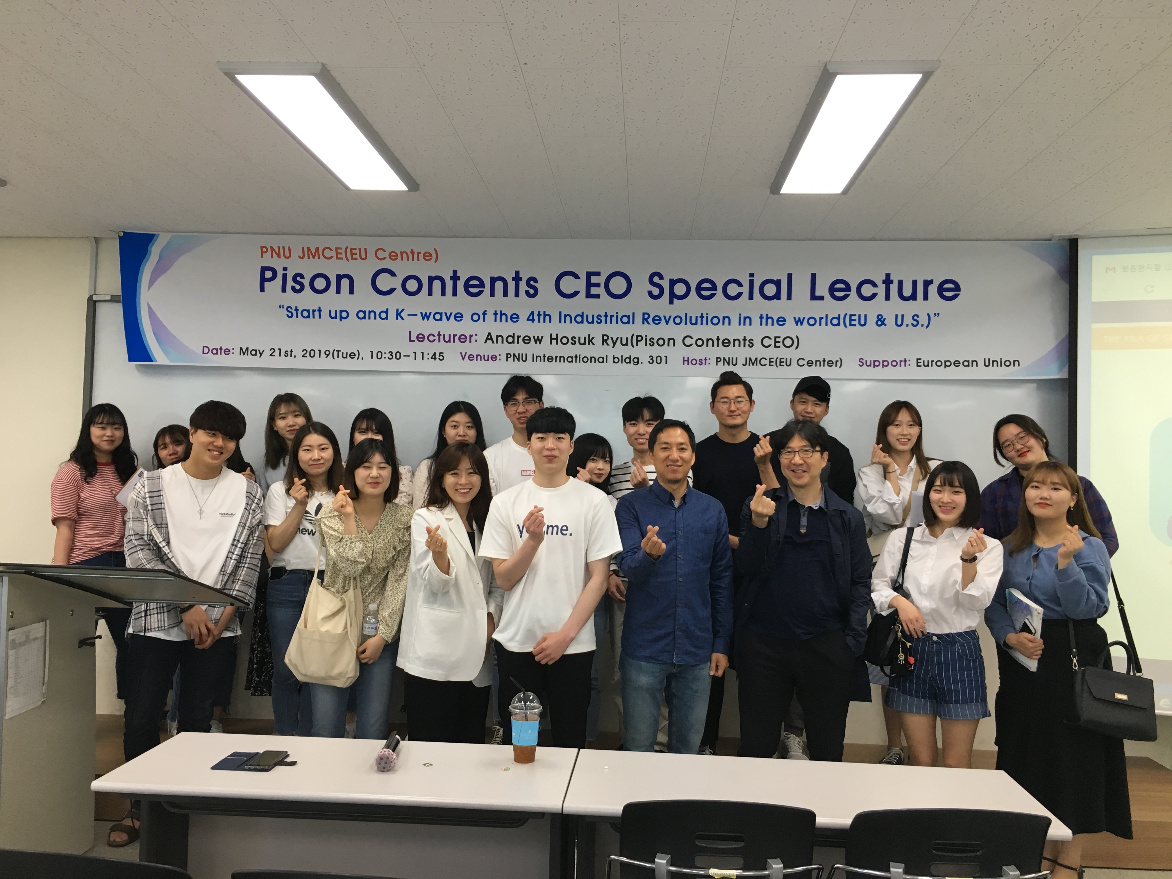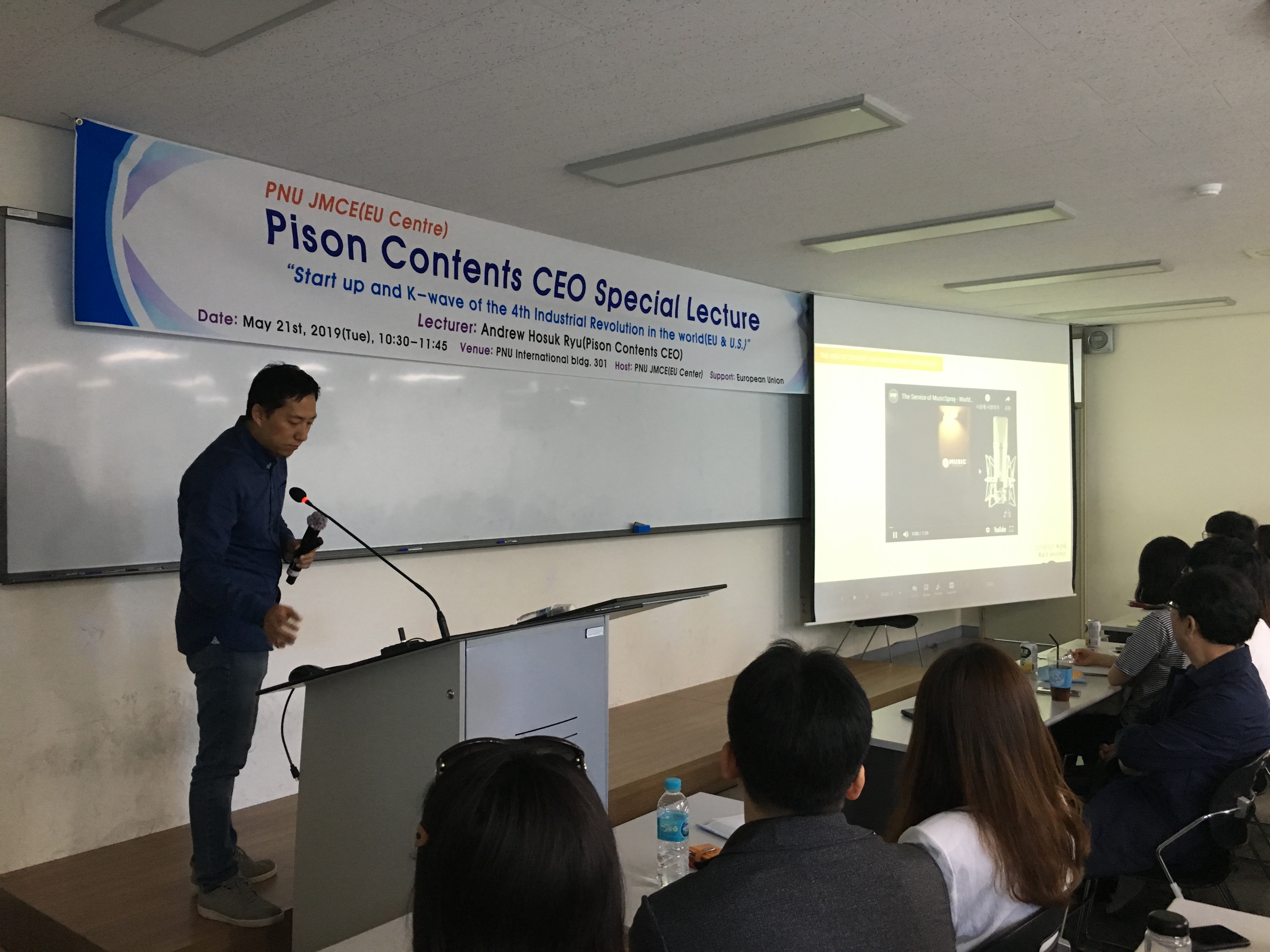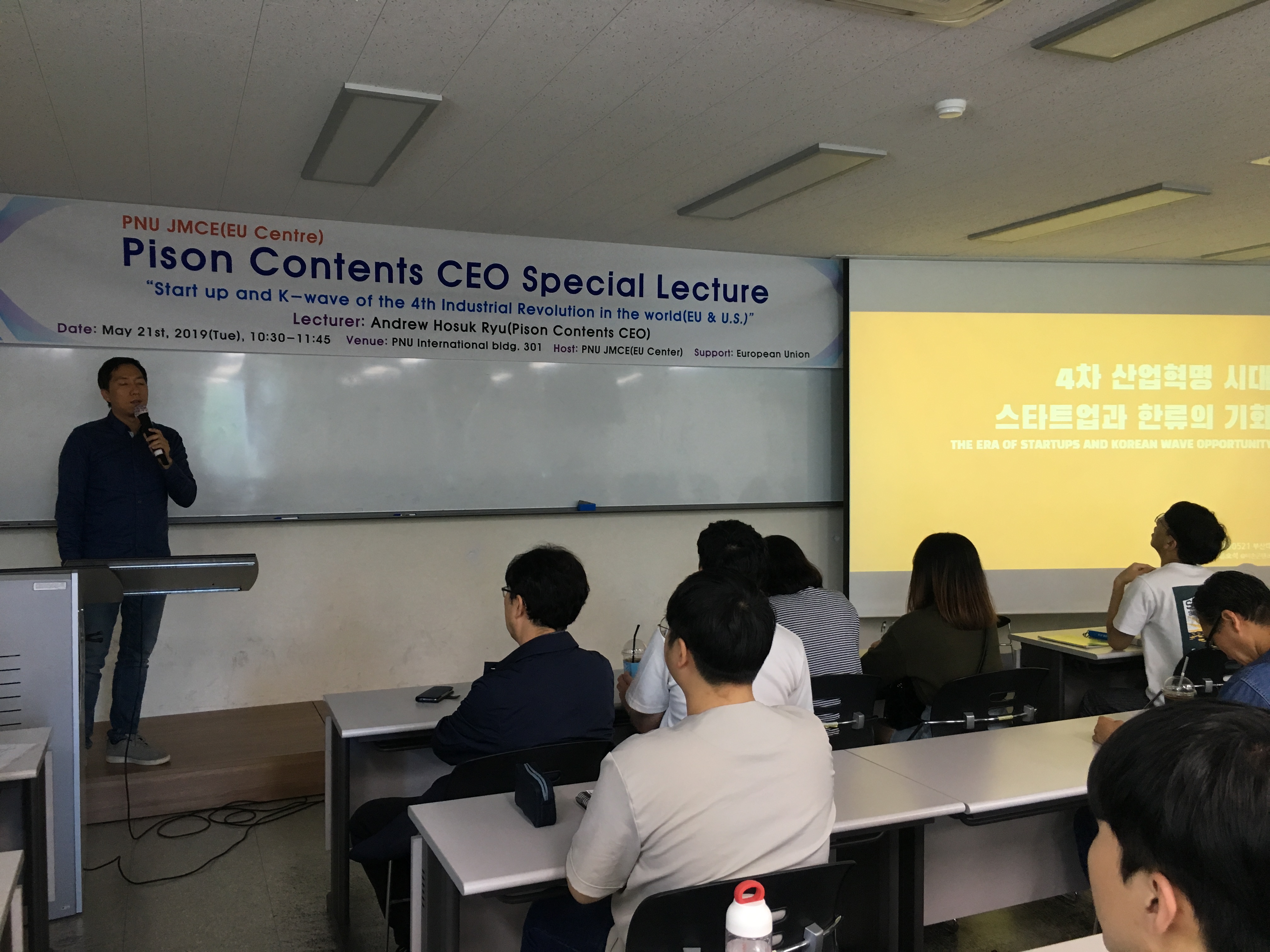 미국 실리콘 밸리 비손 콘텐츠(Pison Contents) - music producer from K-pop 류호석 사장(Andrew Hosuk Ryu)의 특별초청강연이 2019년 5월 21일 화요일 오전 10시 30분부터 정오까지 국제관(경제통상관) 301호에서 진행되었습니다. 5월 유럽의 달을 맞이하여 PNU (JMCE) EU Center에서 주최하고 유럽연합에서 지원하는 두번 째 교내특강의 주제는 "4차 산업혁명 시대의 스타트업 기회와 한류"입니다.